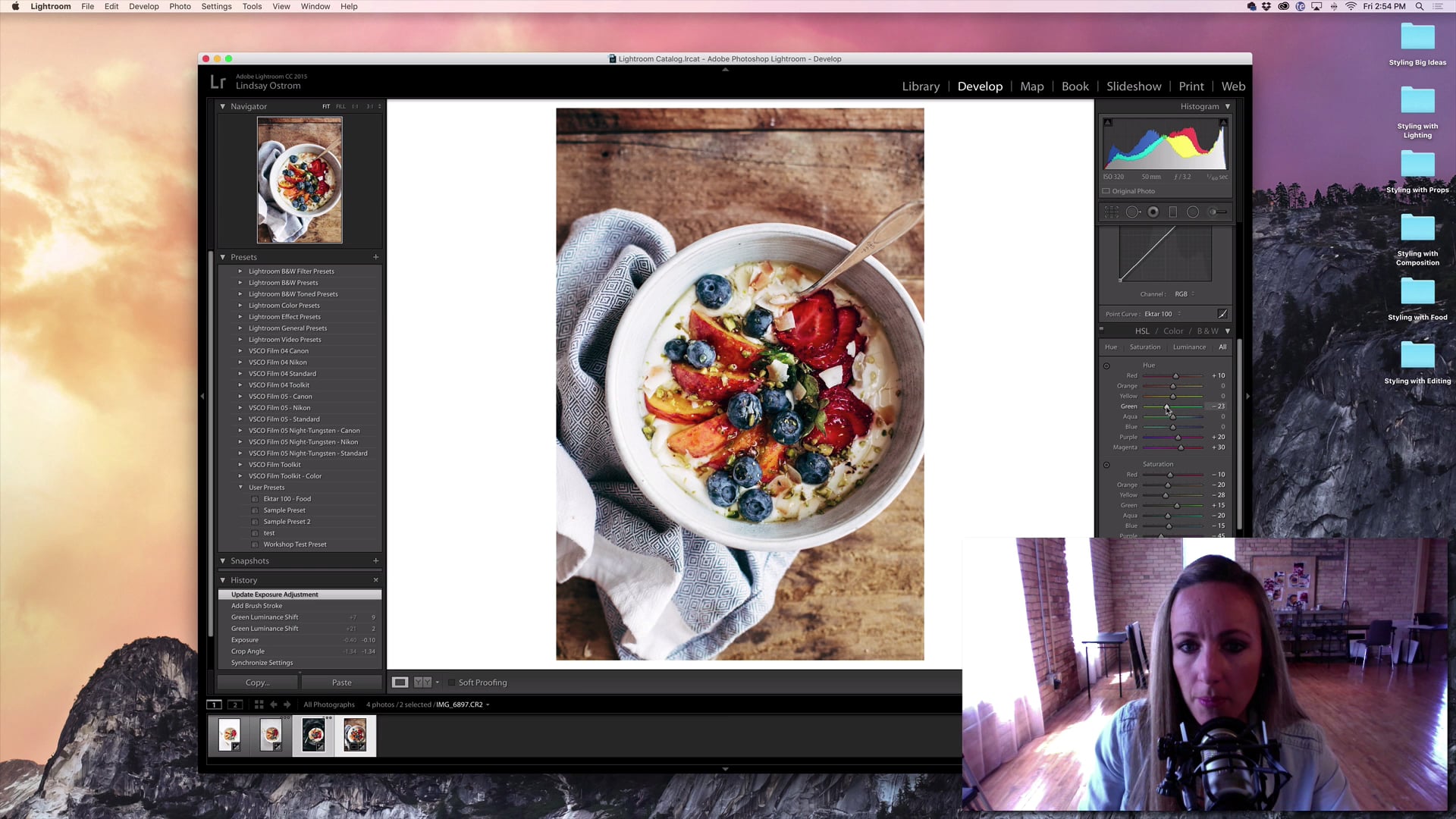 Then she picks up her camera, gathers some food and props, and demonstrates these concepts in a live shoot. You get to see everything from start-to-finish: the initial setup, adding different props, changing the lighting, and the final photo. It’s super neat!