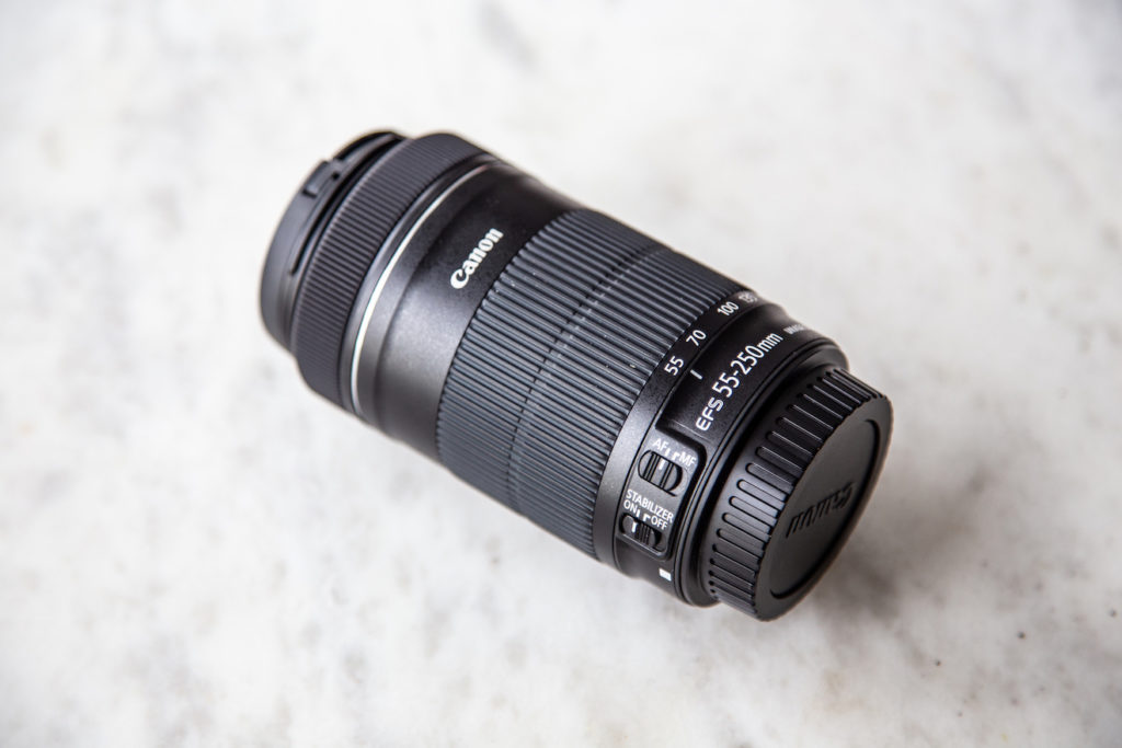 We use the Canon 55-250mm lens with the Canon 7D Mark II for our side-angle shots. It’s a more budget-friendly zoom lens for those close-up detail and texture shots.