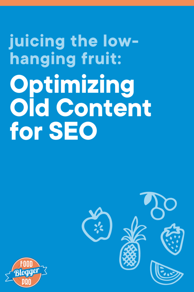 The title of this article, 'Juicing the Low-Hanging Fruit: Optimizing Old Content for SEO' on a blue background with fruit icons and the Food Blogger Pro logo