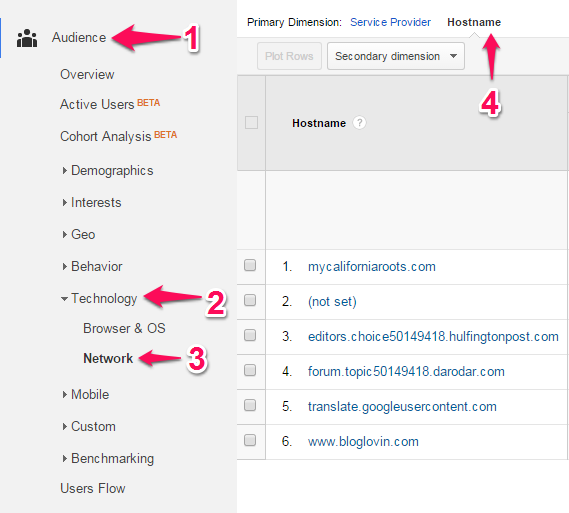 When you are inside your original view, select the longest date range you can – back to the beginning of the life of your blog would be best! Then, click “Audience” from the left-hand menu, then “Technology” and “Network.” Finally, select “Hostname” to display the hostnames.