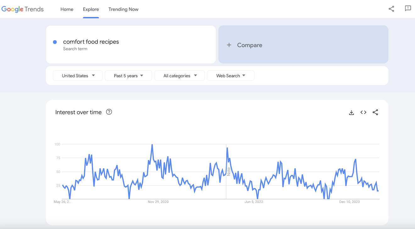 Searches for comfort food recipes start to climb in the early fall season and peak right around the Christmas holiday season.