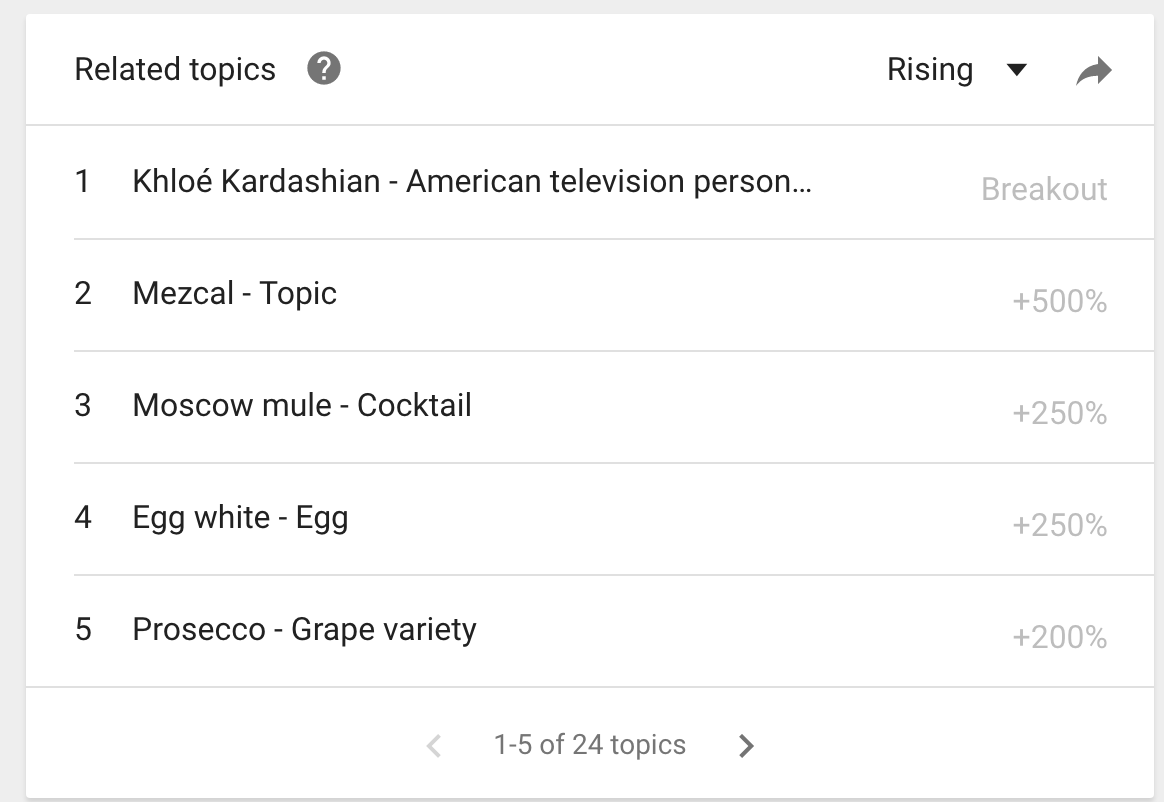 Hey, Ivo! Definitely not random 🙂 I really like Google Trends for figuring out trends in the food space. If you search for “cocktails” (https://trends.google.com/t…, you can scroll down a bit to find “Related topics” and “Related queries,” and you can filter those by Top or Rising topics. I really like checking out the Rising “Related topics” because that shows me how I can niche down the topic I’m looking at.