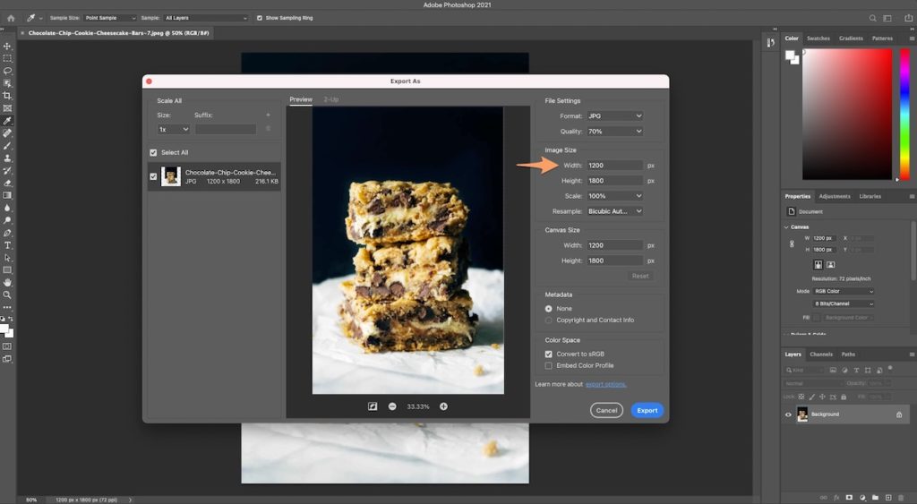Want to take better food photos?Once you have a great photo, it’s time to edit. When you’re editing your photos in Photoshop, Lightroom, or another editing software, there are a few different ways you can minimize the file size and optimize the dimensions of your images: