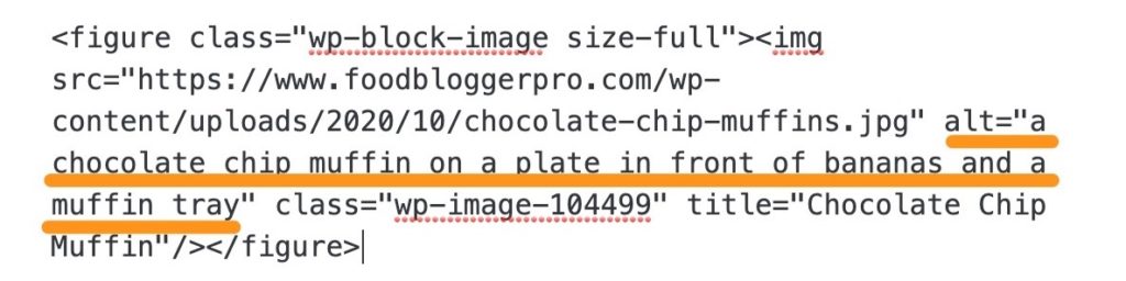 HTML version of an image in an image block on WordPress with the alt tag underlined in orange