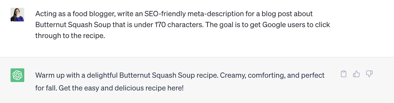 If you’re a food blogger, chances are that you’ve experienced writer’s block. How many different ways can one write a compelling introduction to a recipe post or an SEO-friendly meta-description? Sometimes you just want to switch things up and word things in a different way than you usually do. And that’s where ChatGPT can come in very handy!